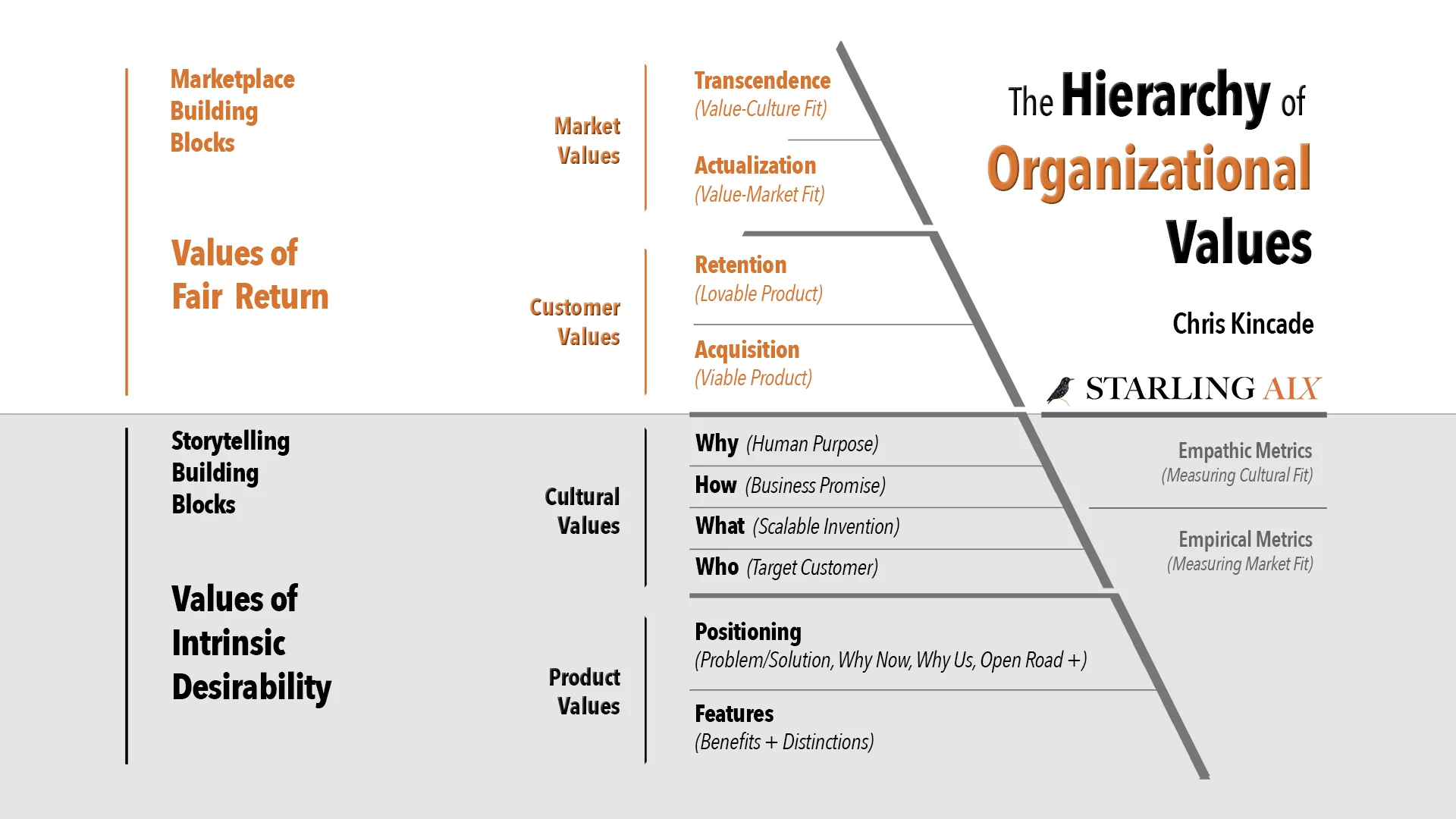 The hierarchy flows upward: Product → Cultural → Customer → Market. Internal values must transform into external validation.