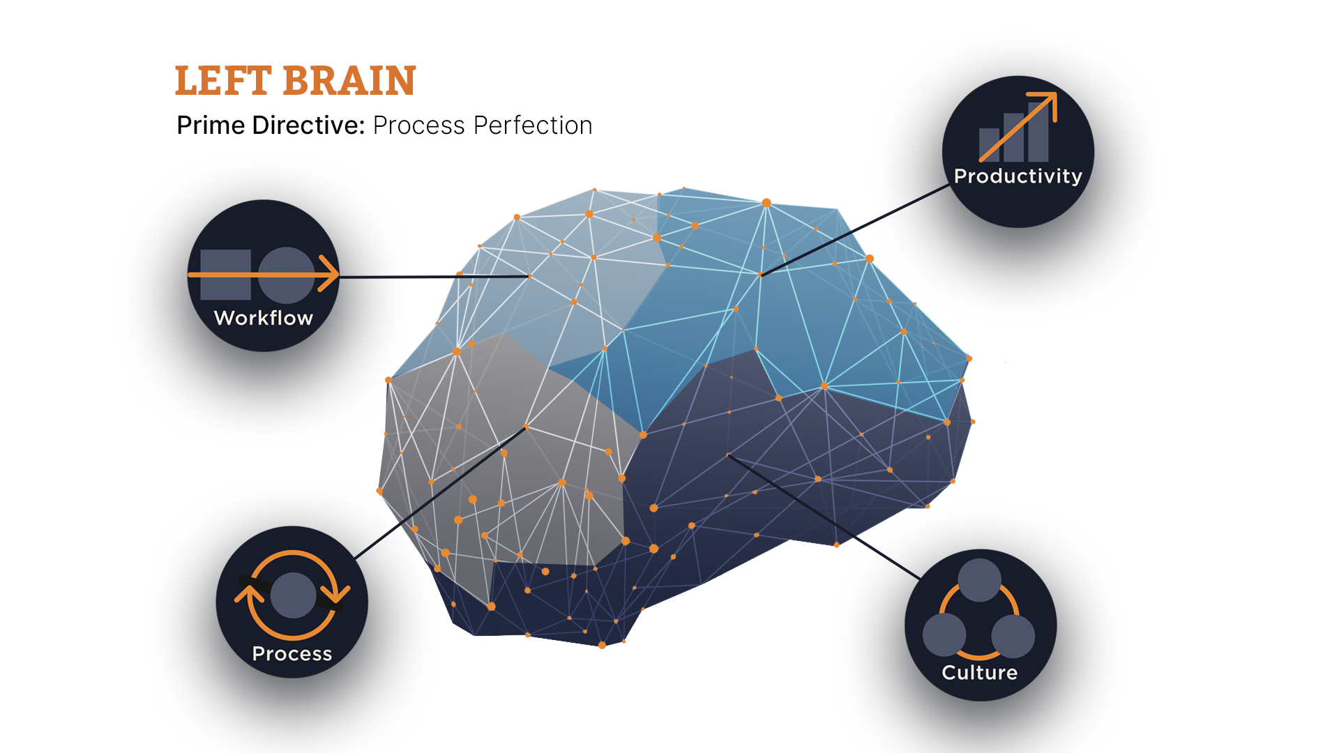 Optimization — the left brain. Executing efficiently, improving processes, building culture that endures. This is where operations live.