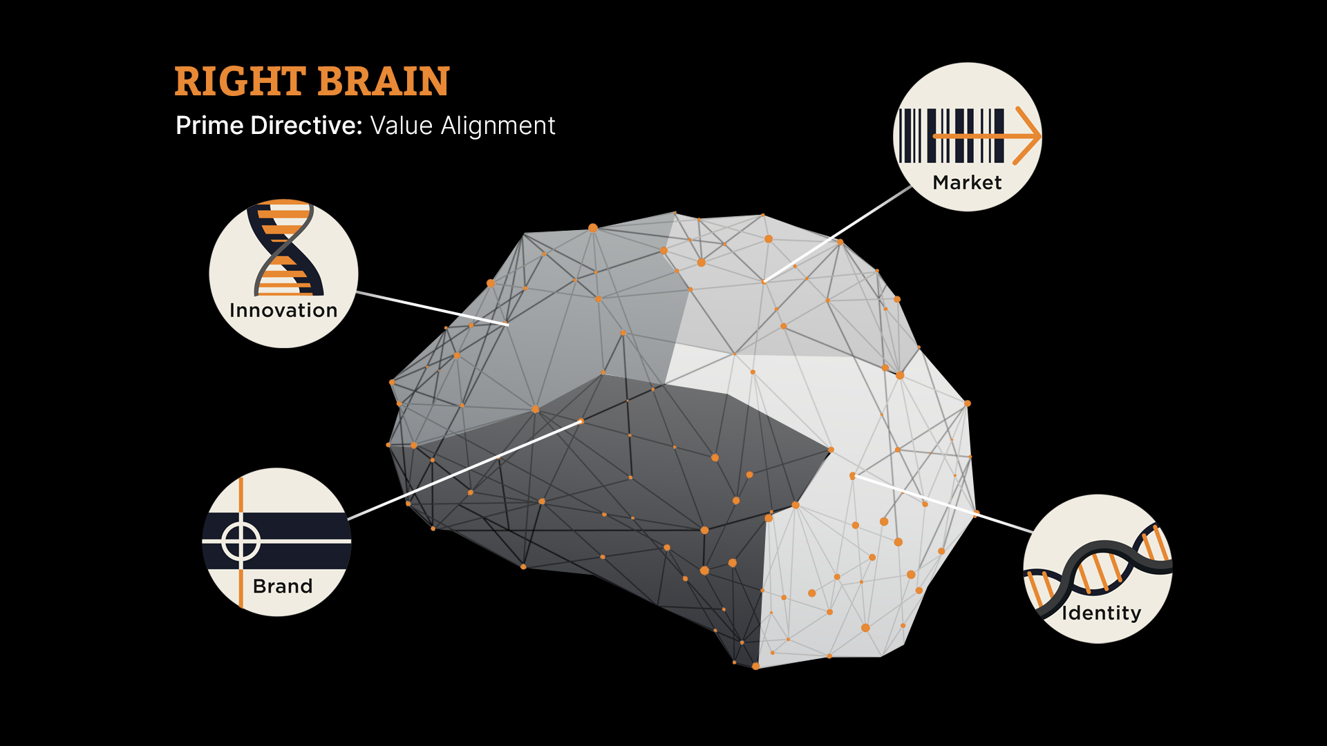 Innovation — the right brain. Creating new value, finding market position, expressing identity. This is where strategy lives.